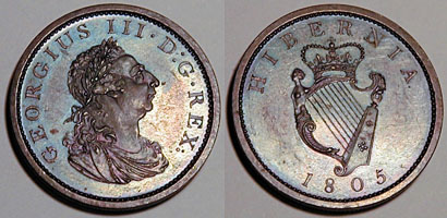an 1805 Irish penny graded Proof-64 by PCGS. The upper image captured by the scanner shows a high amount