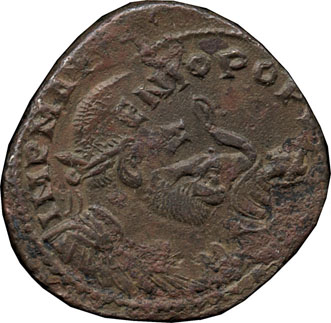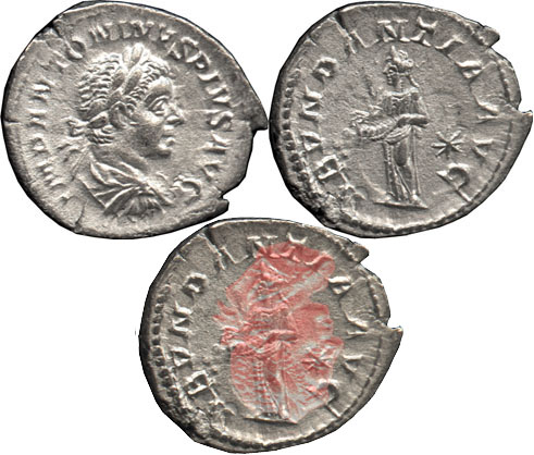 an impression of the reverse die on the obverse (or vice versa). This coin of Maximinus has its GENIO POPULARI