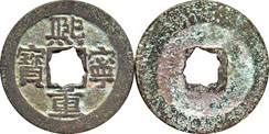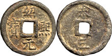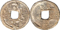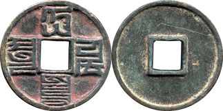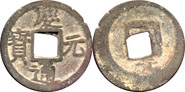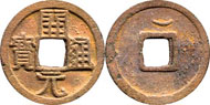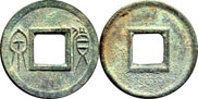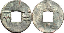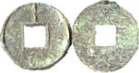 is a cash coin of the Tang Dynasty, 618-626, with the legend "K'ai-yuan t'ung-pao" (The Currency of the K'ai-yuan