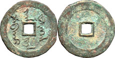 these two coins is from the Western Han Dynasty, 179-157BC, and has the legend "Pan Liang". The lower of these