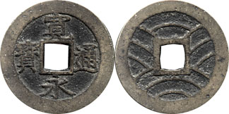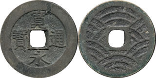 | Obverse Legend: | "Kan ei Tsu hou" read top bottom right left as "generosity" "eternal" "circulate" "treasure", i.e. "Generosity is eternal, circulating treasure" |