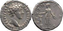 | Reverse: | Juventas standing left holding a patera and sprinkling incense over a candelabrum |