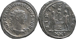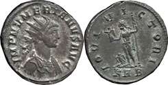 | Reverse: | Numerian standing right receiving Victory on globe from Jupiter, star and Z in field, star above Victory |