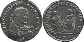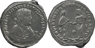 | Reverse: | Diocletian receiving Victory on a globe from Jupiter, A in field |