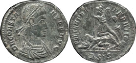 | Reverse: | Constans, holding labarum and phoenix on a globe, standing left, in a galley piloted by Victory |