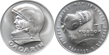 30th anniversary of the first man in space. Baikonur Cosmodrome issued this medal composed of metal from a Soviet spacecraft flown in space.