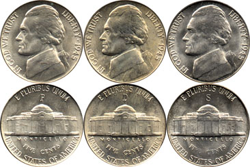 | Type: | 1945 Philadelphia, Denver and San Francisco Jefferson Nickels |