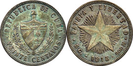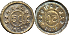 | Minted to pay Gen. Valencia's troops after the Battle of Palonegro in Columbia's civil war, rumored to be struck from the brass of expended cartridges. |