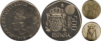 | The circle on the upper right of the reverse is a "hologram" anti-counterfeit measure. When viewed from different angles the image changes from 98, the year of issue, to a crowned M, the mintmark of Madrid. See the 1200dpi magnifications for details. |